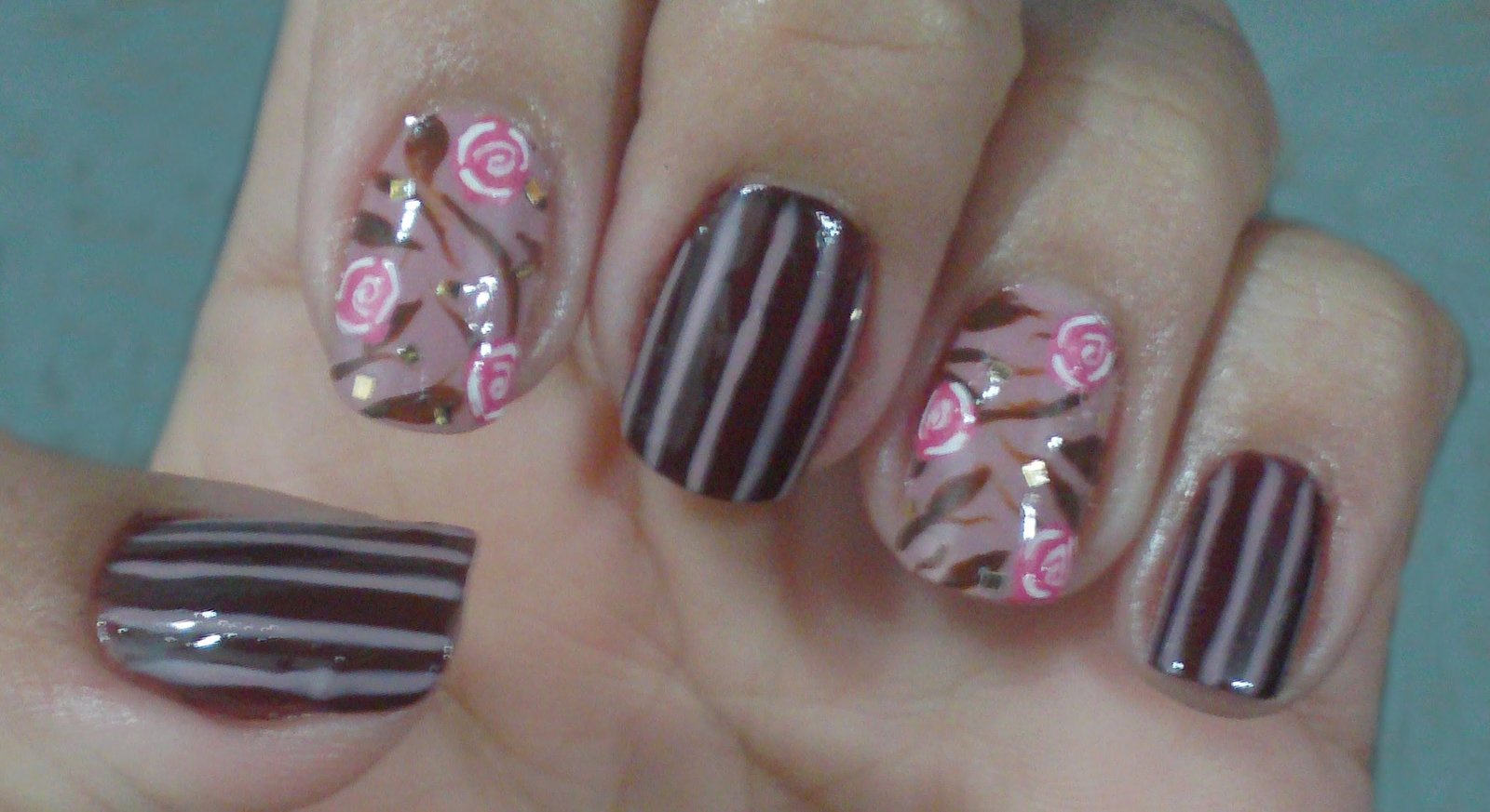Unhas Decoradas Listras com Rosas Manual Bela e Simples Nail Art