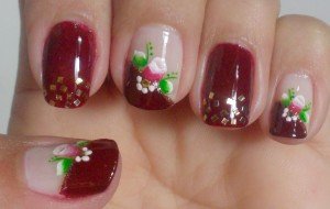 Unhas Decoradas com Rosas e Floquinhos Dourados Nail Art
